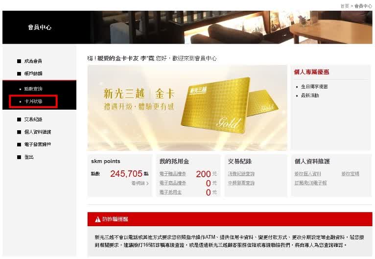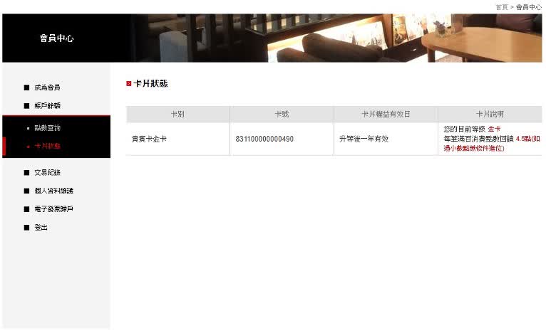 Step4. 點選卡片狀態後,於網頁中即可觀看到金卡會員效期、消費累積金額