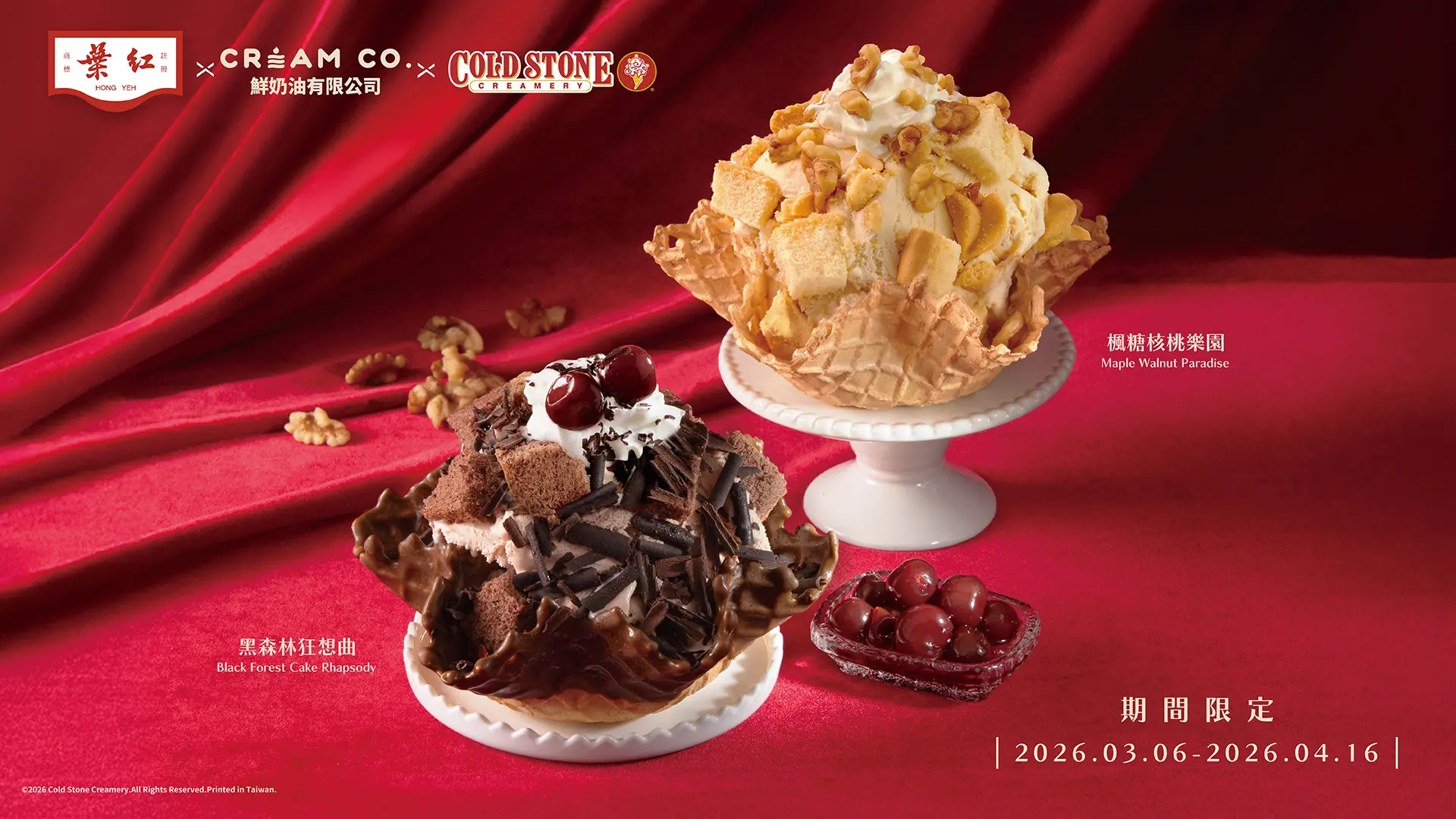 COLDSTONE新品推出,販售時間:即日起-4/16(四) COLDSTONE夢幻攜手紅葉蛋糕CREAM CO. 推出全新跨界聯名,讓經典蛋糕搖身變成特色冰品! 「黑森林狂想曲」完美復刻紅葉經典的黑森林蛋糕,以黑森林蛋糕風味冰淇淋為基底,拌入巧克力蛋糕,上方Topping鮮奶油、黑苦 巧克力削及酒漬櫻桃,還原濃郁的黑森林蛋糕甜點滋味。 「楓糖核桃樂園」將CREAM CO.的楓糖核桃蛋糕變成冰淇淋!楓糖風味冰淇淋與奶油酥餅及海綿蛋糕的多層次口感,上方Topping鮮奶油與撒上海鹽核桃,鹹甜交織的濃郁享受。