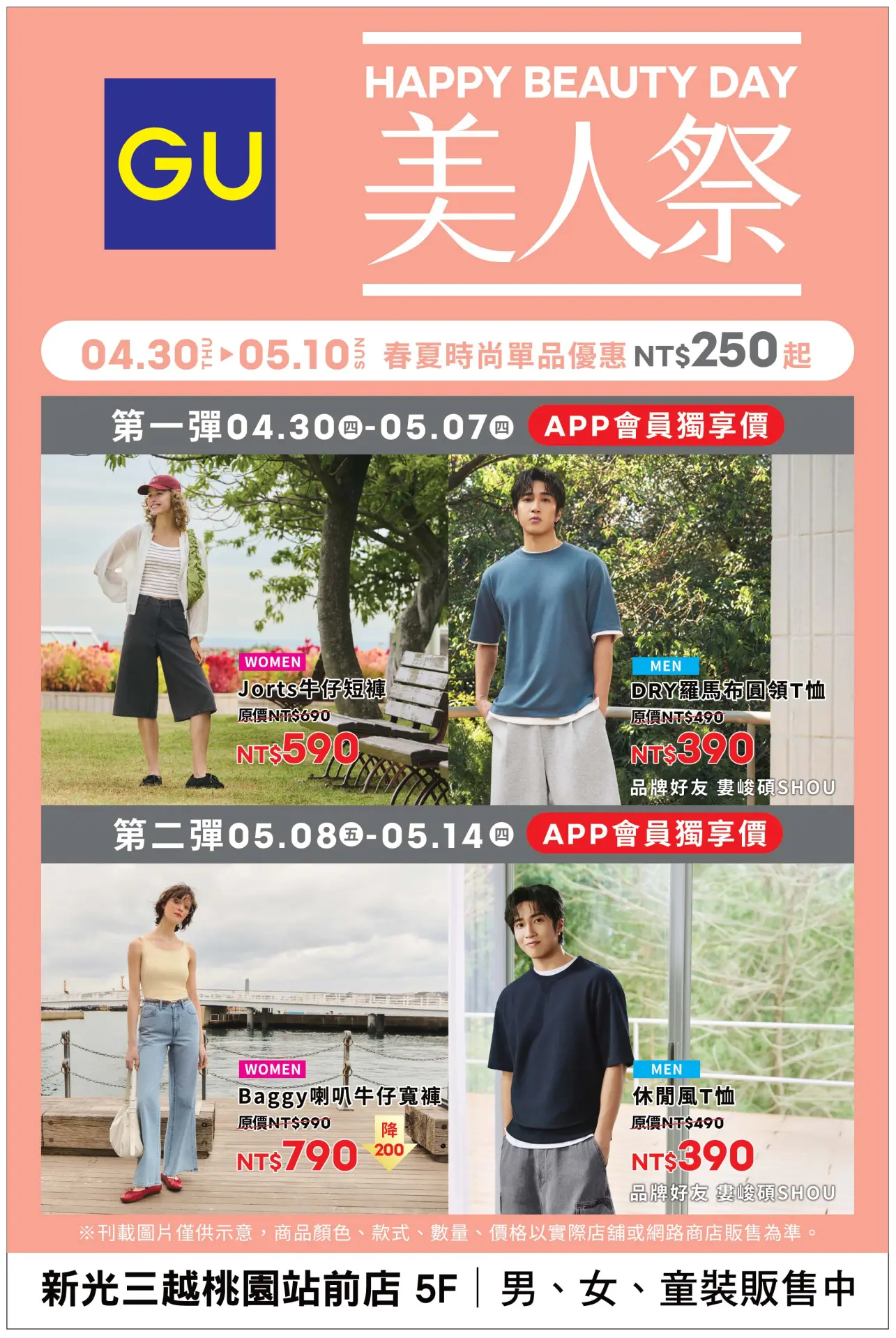 美人祭於GU專櫃消費享「春夏時尚單品優惠250元起」,指定款式享品牌會員獨家款折扣